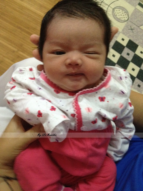 Setelah Zulaikha dalam hari.. Tiba la masa dia dah cukup sebulan.  Senang kira kita ikut tarikh lahir la kan. 6.7.2012.  Alhamdulillah Zulaikha dalam hari tidak kene kuning.  Mandi pun tak menangis.. So far memang tak banyak ragam..